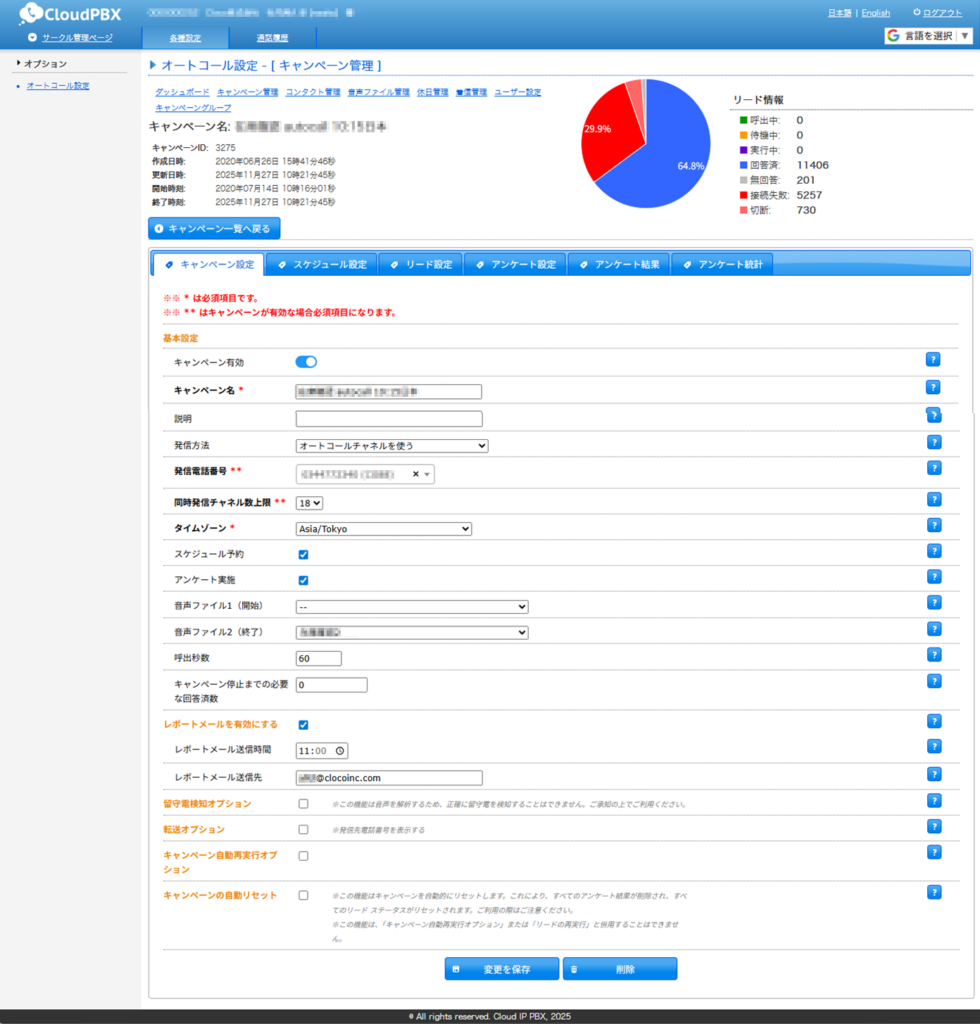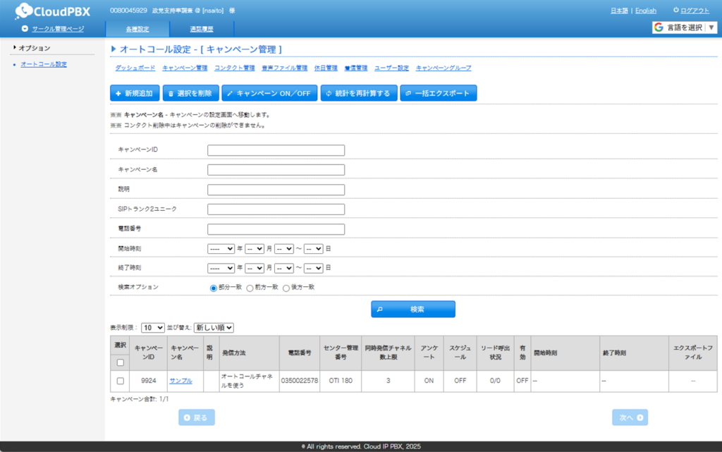 コンタクト管理に入れた電話のかけ先を、キャンペーンと紐づける画面です。